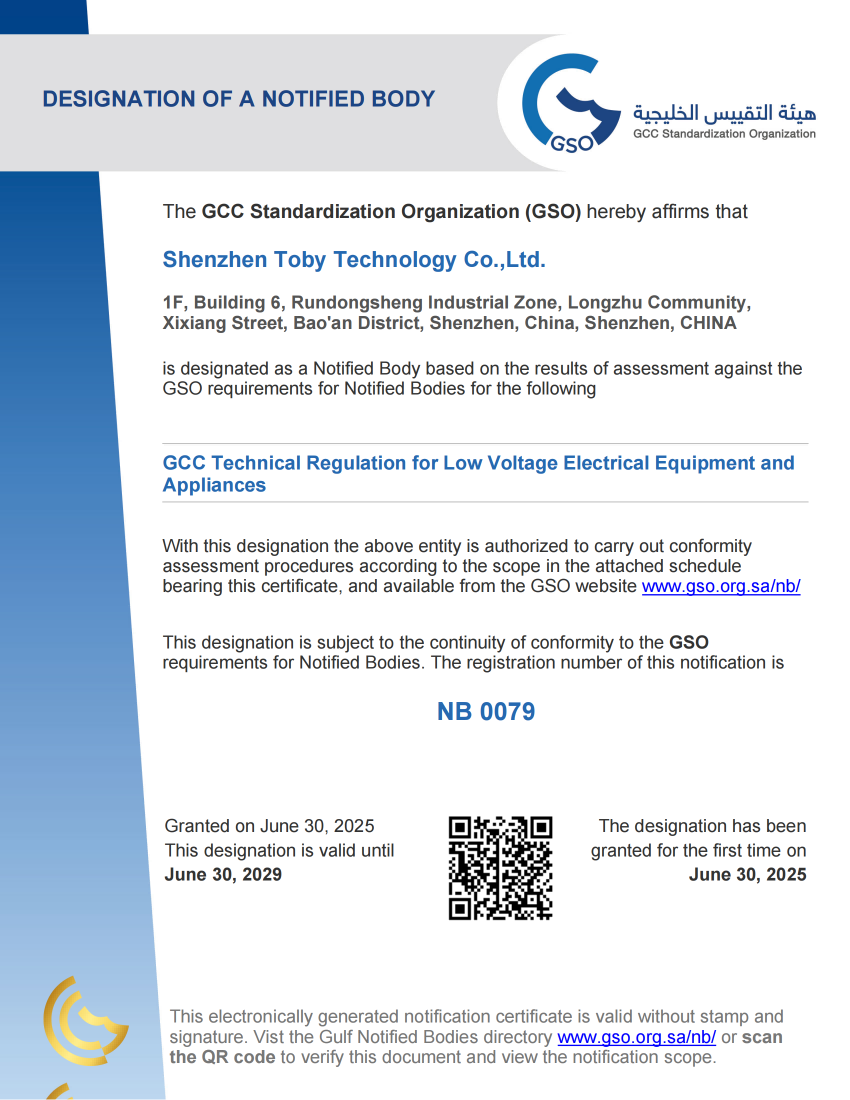 Cotecna中瑞集团旗下电子电器实验室——中瑞腾标(深圳)检测有限公司(“Toby检测”)近日顺利通过海湾标准化组织(GSO)现场评审,正式获得中东GSO公告机构(Notified Body, NB)资质。