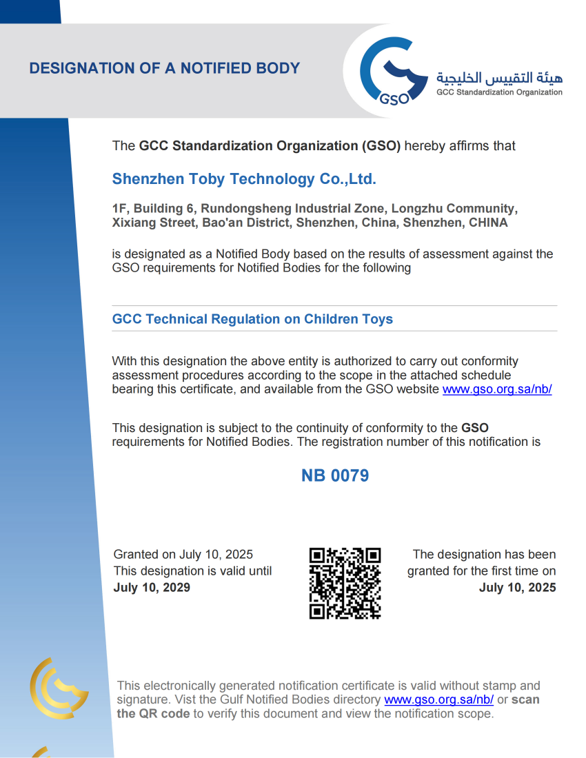 作为海湾标准化组织(GSO)批准的公告机构(NB),Toby检测可提供对低压电气产品(LVE)及儿童玩具(Toys)的G-Mark认证服务。获得认证的上述产品可在海湾合作委员会(GCC)的任何成员国市场销售。